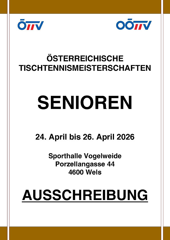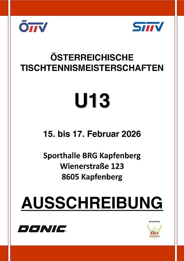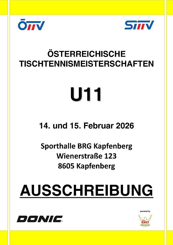 Die Österreichischen Tischtennis Meisterschaften U11 und U13 finden vom 14. bis 17. Februar 2026 in der Steiermark in Kapfenberg statt. |